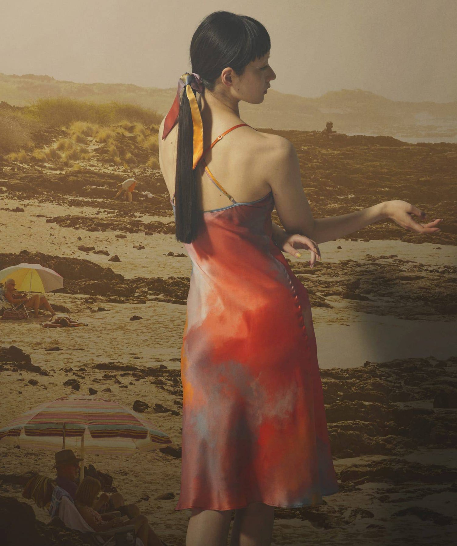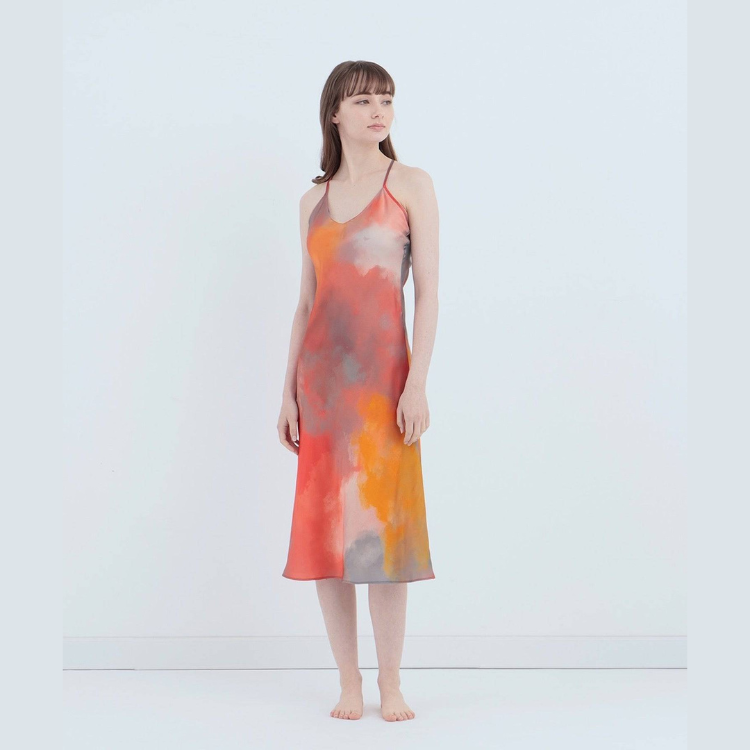 • 渡假風情款 水彩紋純蠶絲細肩帶洋裝 晚霞