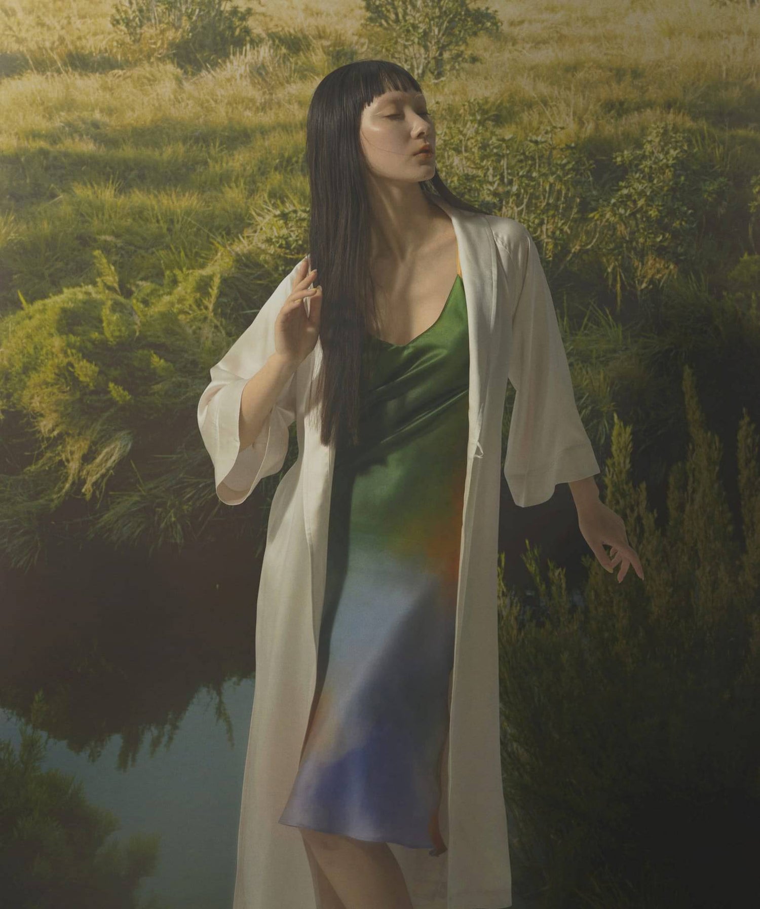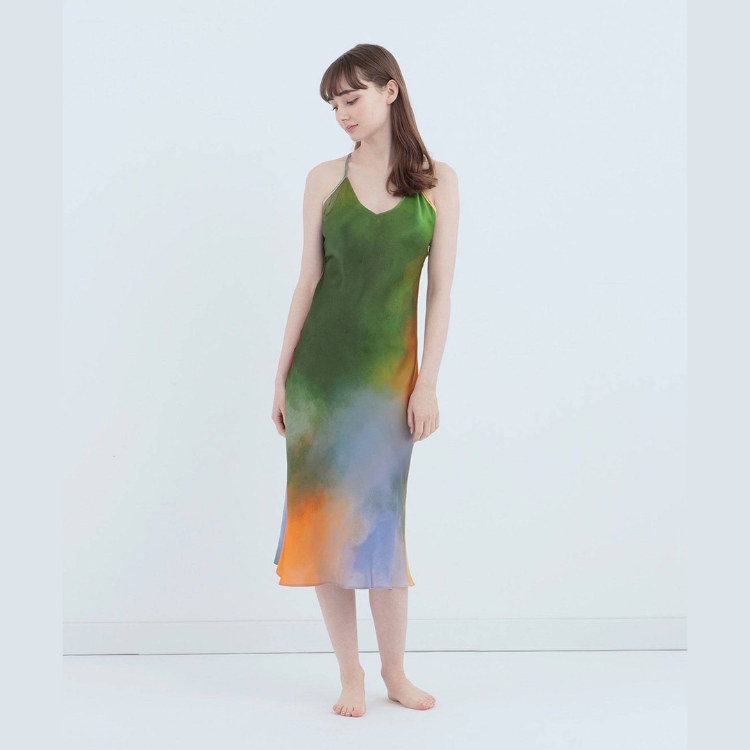 • 渡假風情款 水彩紋純蠶絲細肩帶洋裝 迷霧湖畔