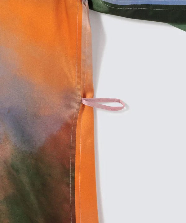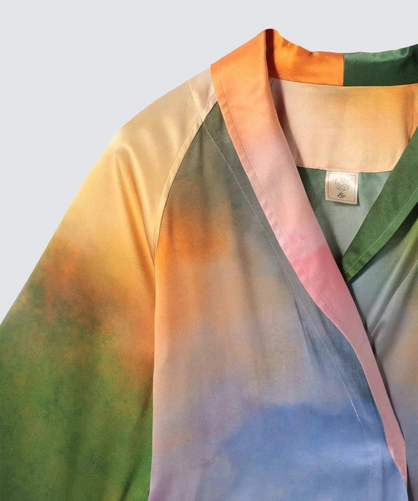 用柔和且溫暖的色調表現夕陽時分的空氣氛圍以及風景中透出的迷濛感。色彩靈感源自陽光、森林和水。由於每件面料透過三道染製加工處理,呈現花紋不同每件是獨一無二世界上唯一一件。