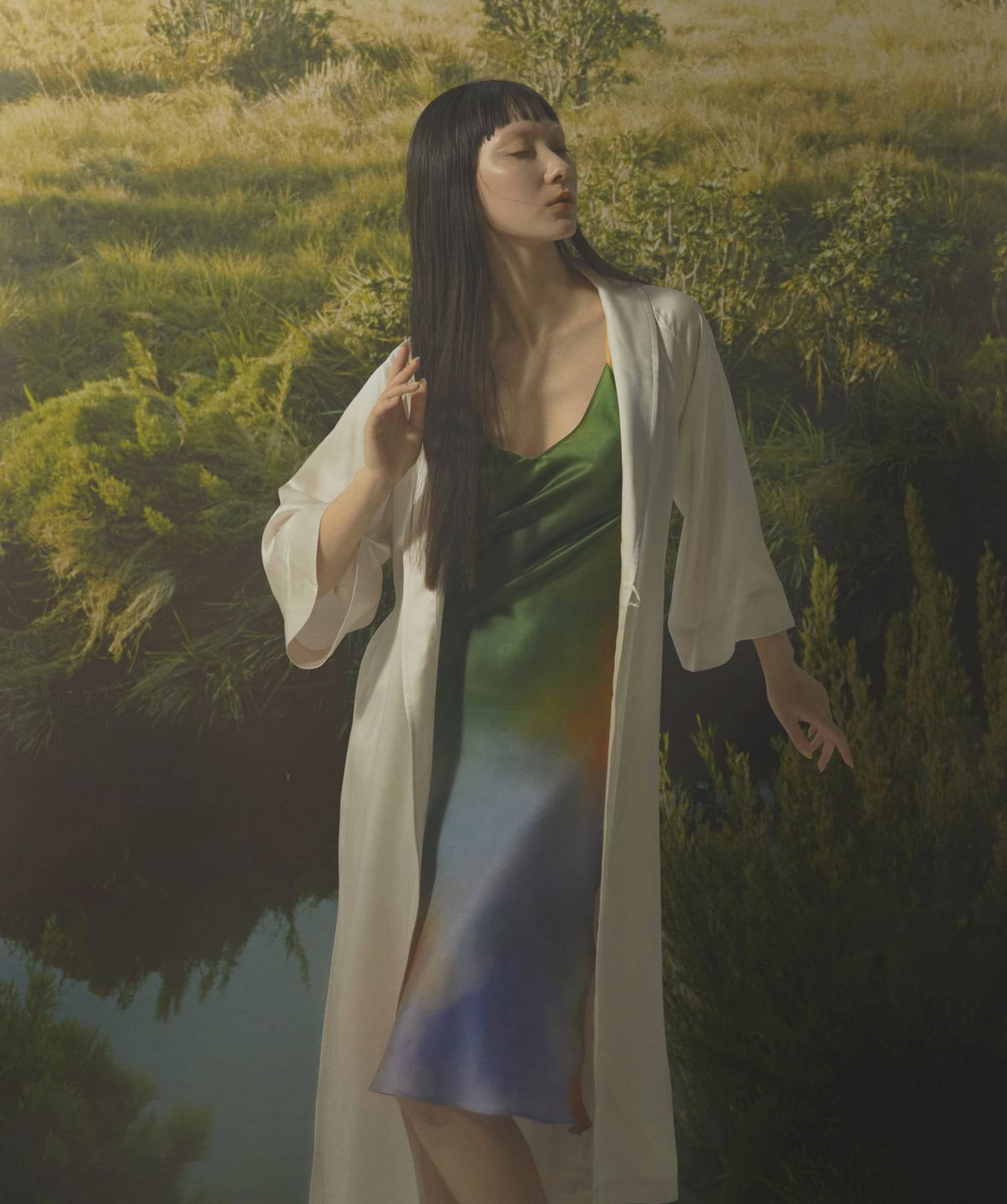 用柔和且溫暖的色調表現夕陽時分的空氣氛圍以及風景中透出的迷濛感。色彩靈感源自陽光、森林和水。由於每件面料透過三道染製加工處理,呈現花紋不同每件是獨一無二世界上唯一一件。