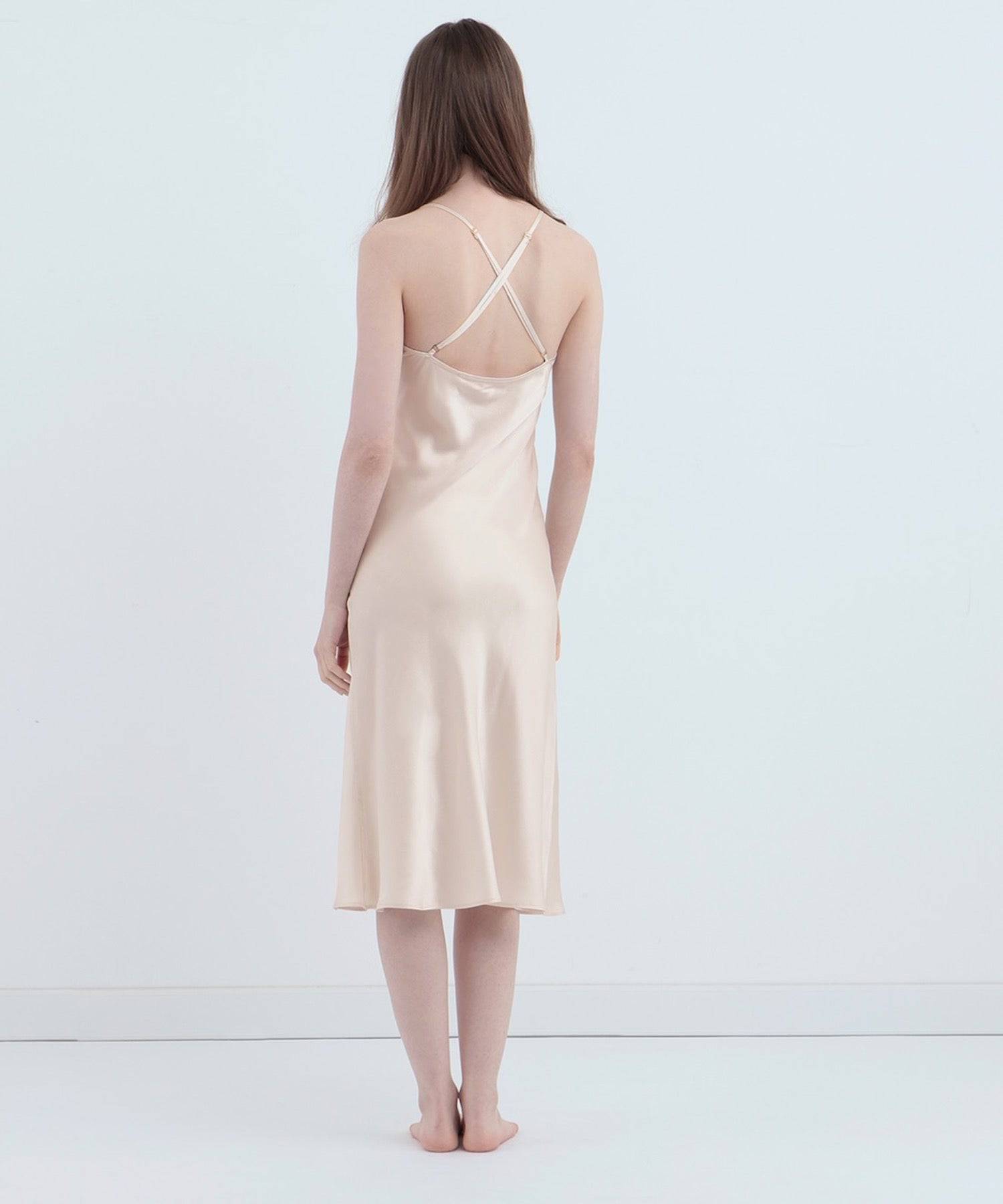 不僅肩帶可調整尺寸,還有內置杯墊。稍微收束腰的設計剪裁具修身效果,不僅適合作為居家睡衣,也可當作外出洋裝搭配。